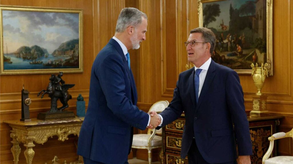 El Rey ha decidido proponer al presidente del PP, Alberto Núñez Feijóo, para que se someta al debate de investidura, tras la ronda de consultas que ha realizado este lunes y martes con las siete formaciones del Congreso que han querido acudir al Palacio de la Zarzuela. Así se lo ha comunicado este martes por la tarde el monarca Zarzuela a la presidenta del Congreso, Francina Armengol, a la que ha convocado en Zarzuela para trasladarle su decisión. Por primera vez, el Jefe del Estado se ha enfrentado a la situación inédita de tener dos aspirantes a ser nominados: Alberto Núñez Feijóo, que ganó los comicios del 23 de julio y que cuenta con el apoyo comprometido de 172 diputados de cuatro partidos (PP, Vox, CC y UPN), y el socialista Pedro Sánchez, quien se ve capaz de tejer alianzas para lograr una mayoría absoluta como la que le permitió controlar la Mesa del Congreso hace una semana. (Fuente: Congreso / Casa Real)