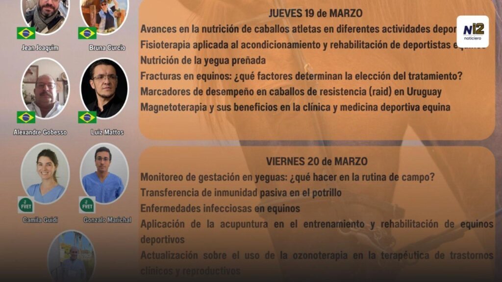 El cronograma incluye temas como el monitoreo de gestación en yeguas, transferencia de inmunidad en potrillos, fracturas en equinos y el uso de terapias complementarias como la ozonoterapia y la magnetoterapia. Además, se realizarán mesas redondas sobre aspectos regulatorios, como el pasaporte equino.